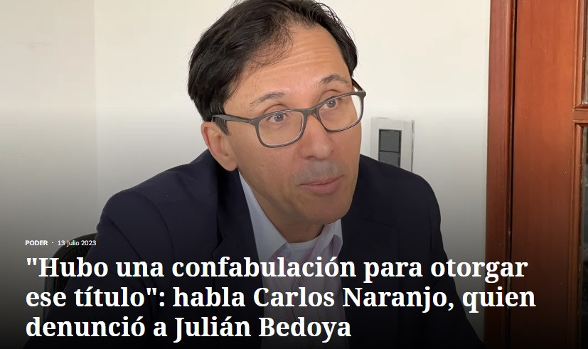 Consultar Imagén y Entrevista: Juliana Ramirez, Revista Cambio (2023) "Hubo una confabulación para otorgar ese título": habla Carlos Naranjo, quien denunció a Julián Bedoya". Entrevista Carlos Eduardo Naranjo Florez, último acceso el 22 de febrero de 2024 en: https://cambiocolombia.com